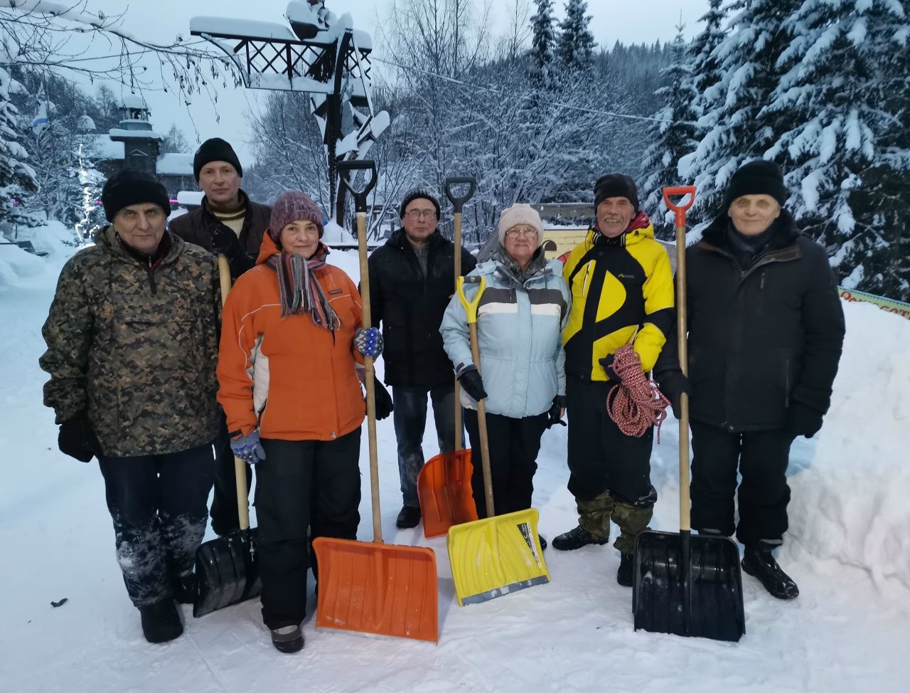 Дружная и весёлая команда привела в порядок Женин остров: скинули снег с шатрового покрытия зрительного зала, очистили подход к очагу и беседке, убрали снег с крыши «Конторы».